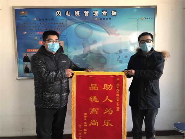 本以爲這是一件不足挂齒小事,王俊程也沒放在心上。過了有半個月左右,姜大姐的親屬找到礦上并送來一面繡有“助人爲樂、品德高尚”的錦旗。原來,那天晚上王俊程走後,姜大姐才想起沒有留下好心人的電話号碼和單位,但是隐約間記起車内有一件招金工作服。後經在招金礦業上班的親屬幫忙分析車輛駛來的方向和車牌,然後多方托人打聽就找到了王俊程的單位。所以姜大姐連忙做好錦旗送到了大尹格莊金礦,找到了這位雪夜中的招金好心人。