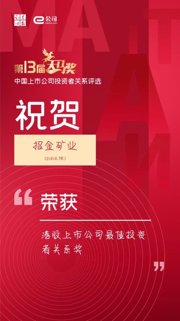 2022年4月22日,證券時報發布的“第十三屆中國上市公司投資者關系天馬獎”評選榜單隆重揭曉,招金礦業股份有限公司以卓越的投資者管理水平赢得了市場和投資者的廣泛認可,榮獲“港股上市公司最佳投資者關系獎”獎項。
