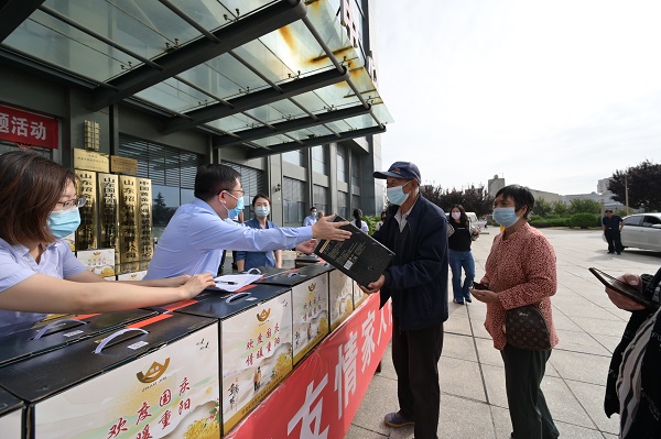 在招金科技辦公樓前,工作人員早早開始忙碌,懸挂條幅,擺放慰問品,布置現場,精心準備。埠外企業員工父母陸續到達活動現場,在工作人員的引導下,秩序井然的領取節日禮品,每一位到場的招金員工父母臉上都洋溢着自豪和微笑。