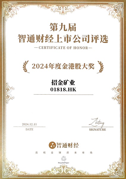年終歲末,招金礦業在資本市場上捷報頻傳,殊榮不斷。公司在智通财經第九屆資本市場年會上榮獲“2024年度金港股大獎、最佳ESG公司獎”;在格隆彙金格獎年度卓越公司評選中榮獲“年度港股通最受歡迎企業”;在财聯社第五屆企業ESG論壇暨緻遠獎中榮獲“ESG先鋒獎”。憑借穩健的經營成果、規範的公司治理與良好的投資者關系,公司接連榮獲資本市場多項大獎,充分彰顯了業界和投資者對公司實力和發展信心的認可,提升了公司的良好品牌形象。