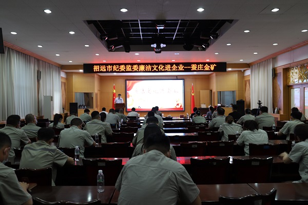 7月28日,招金礦業股份有限公司紀委聯合招遠市紀委監委工作人員來到蠶莊金礦開展廉潔文化進企業授課活動,該礦領導班子、中層幹部以及重點崗位共50餘人參加。活動由招金礦業紀檢辦主任孫兆勇主持,市紀委派駐第二紀檢監察組副組長李燕芹擔任主講。