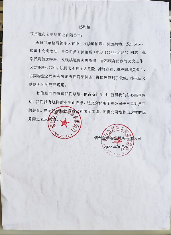 因爲孫俊磊對火情處置及時得當,火情在第一時間得到了有效控制,在最短時間内被撲滅,各種損失被降到了最低。事後,他守口如瓶,從未向同事及朋友提及此事,若不是這封感謝信,他會一直“瞞”下去。他說:“我在礦上就兼職應急救護隊員,無論是在單位,還是在生活中,遇到這種情況理應沖鋒在前。火警響起迎火而上,這是我義不容辭的職責。”