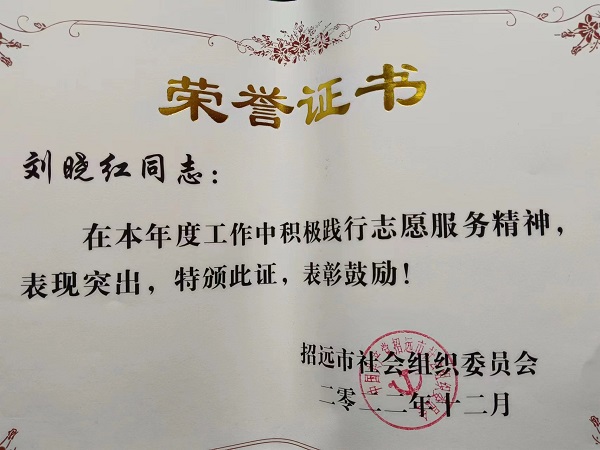 一顆愛心傳遞下去,必将燃成星星之火,爲更多的人照亮前行道路。劉曉紅以“行勝于言”的執着帶動一雙兒女、親人和同事也加入了志願者的隊伍。四年時間裏,她參與志願服務時長累計820餘小時,連續多年被招遠市金太陽志願服務中心授予“優秀志願者”榮譽稱号;2022年,被招遠市社會組織委員會授予“優秀志願者”榮譽稱号。