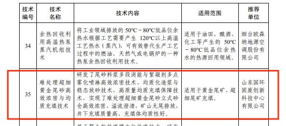 近日,山東省科學技術廳與山東省生态環境廳聯合印發了《2023年山東省綠色低碳技術成果目錄》。山東國環固廢創新科技中心有限公司提報的《難處理超細黃金尾砂高效濃密與均質充填技術》成功入選。