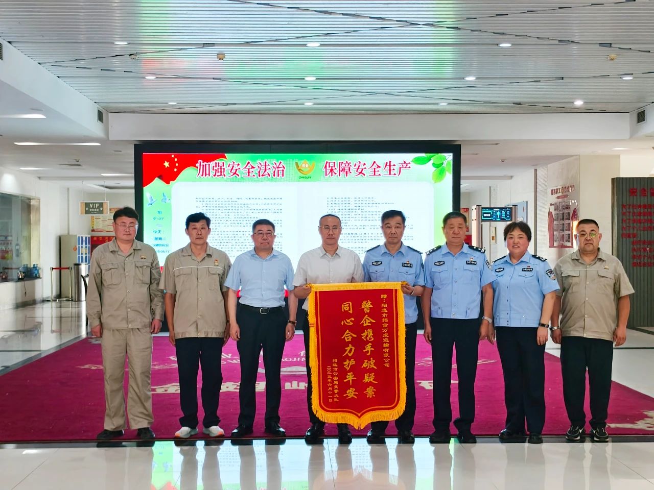 6月17日上午,招遠市交警大隊大隊長姜玉意一行來到招遠市招金萬成運輸有限公司,送來一面印有“警企攜手破疑案 同心合力護平安”的錦旗,對企業在“5·31”交通肇事逃逸案偵破過程中發揮的關鍵作用表示感謝。