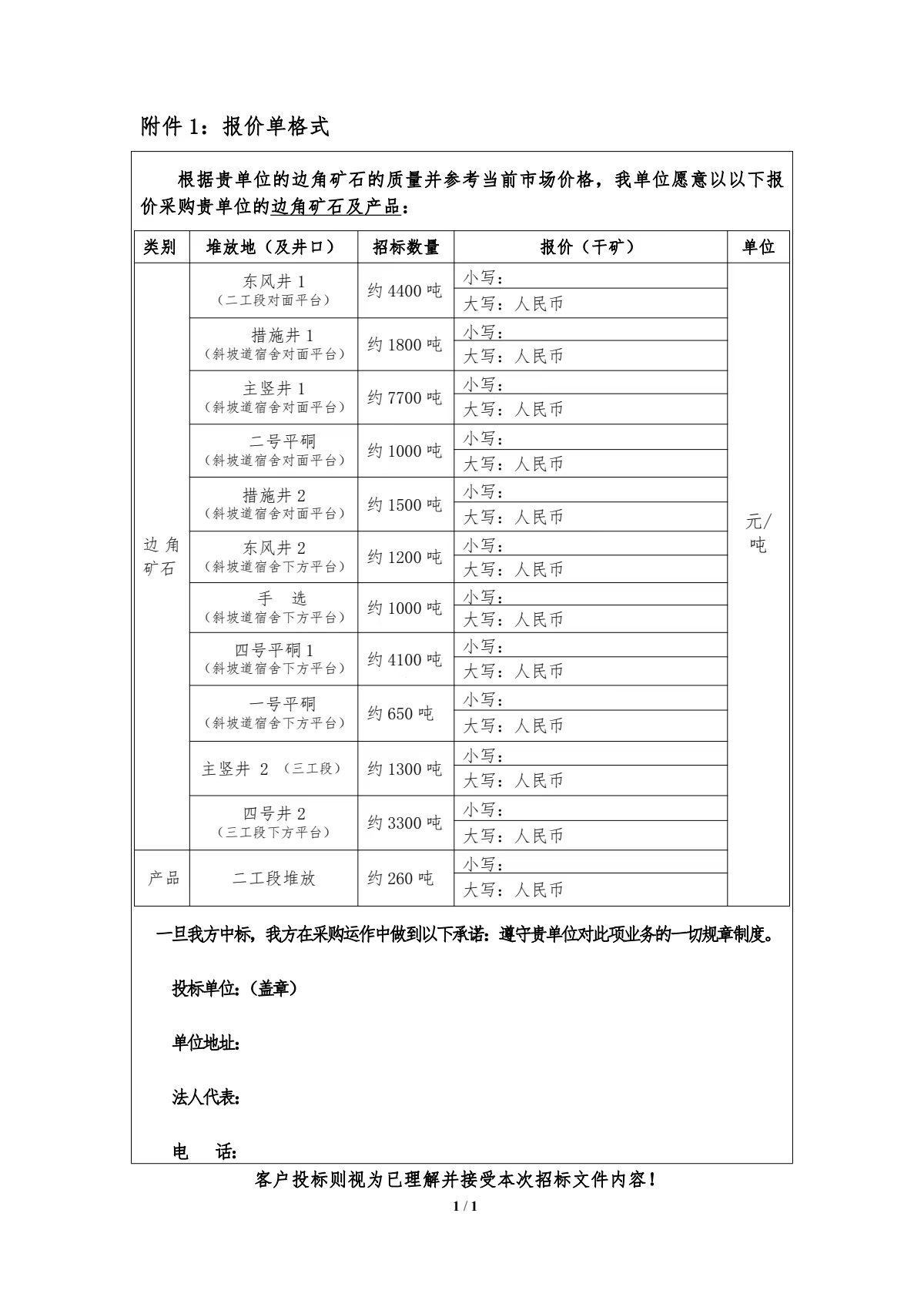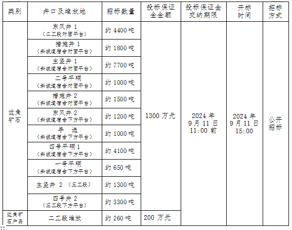 注:本次招标産品數量爲預估數,投标按幹礦報價,中标結算濕礦以實際過磅數爲準,水分按2%扣除計算幹礦;邊角礦石産品水分由中标人及我公司相關科室、車間人員現場取樣、我公司化驗的水分數據爲準。如中标人需要,我公司開具甘肅省增值稅普通發票(黃金)。
