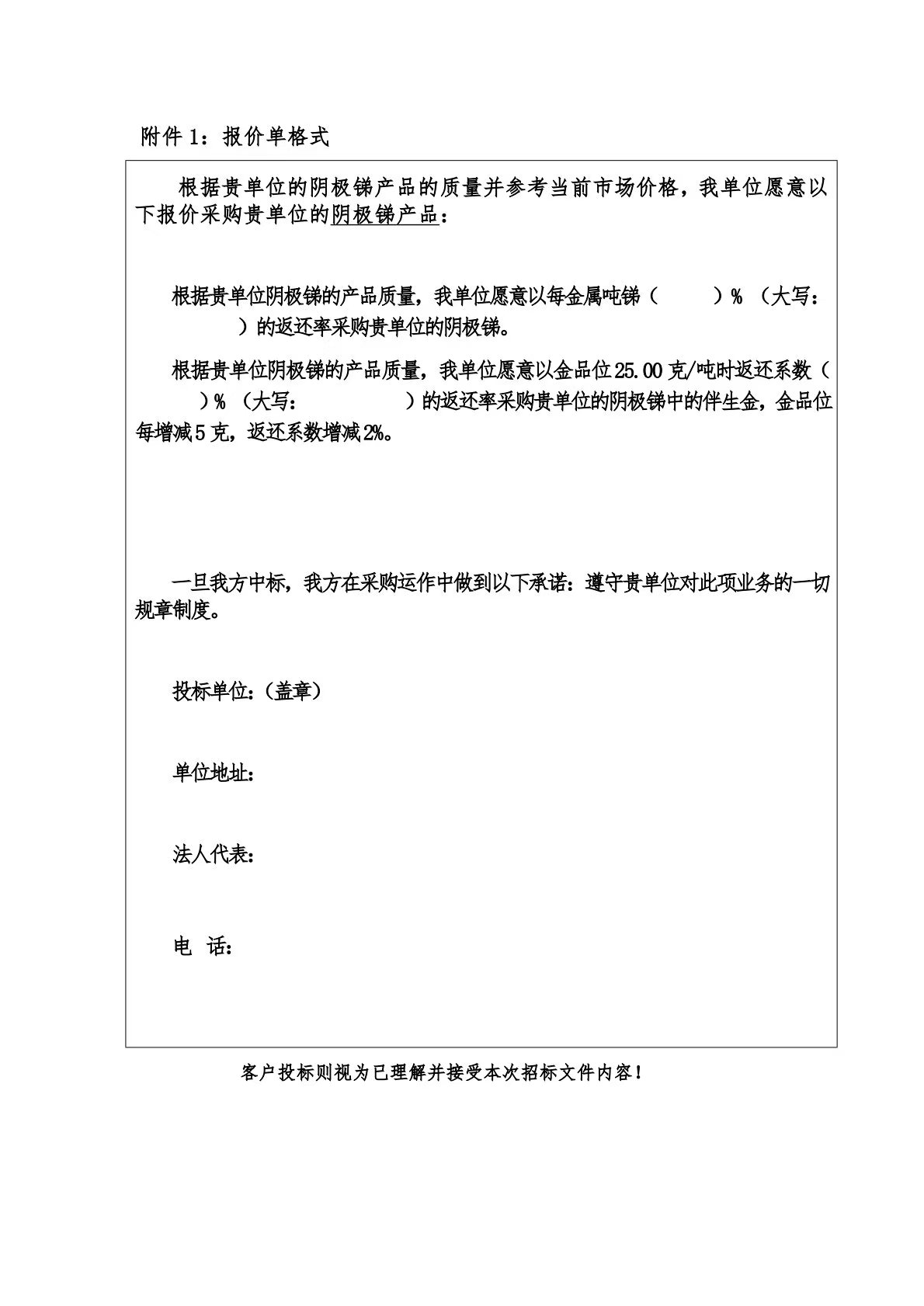 3、陰極銻報價方式:本次招标該産品以每噸幹重中銻含量與金含量的返還系數進行報價。
